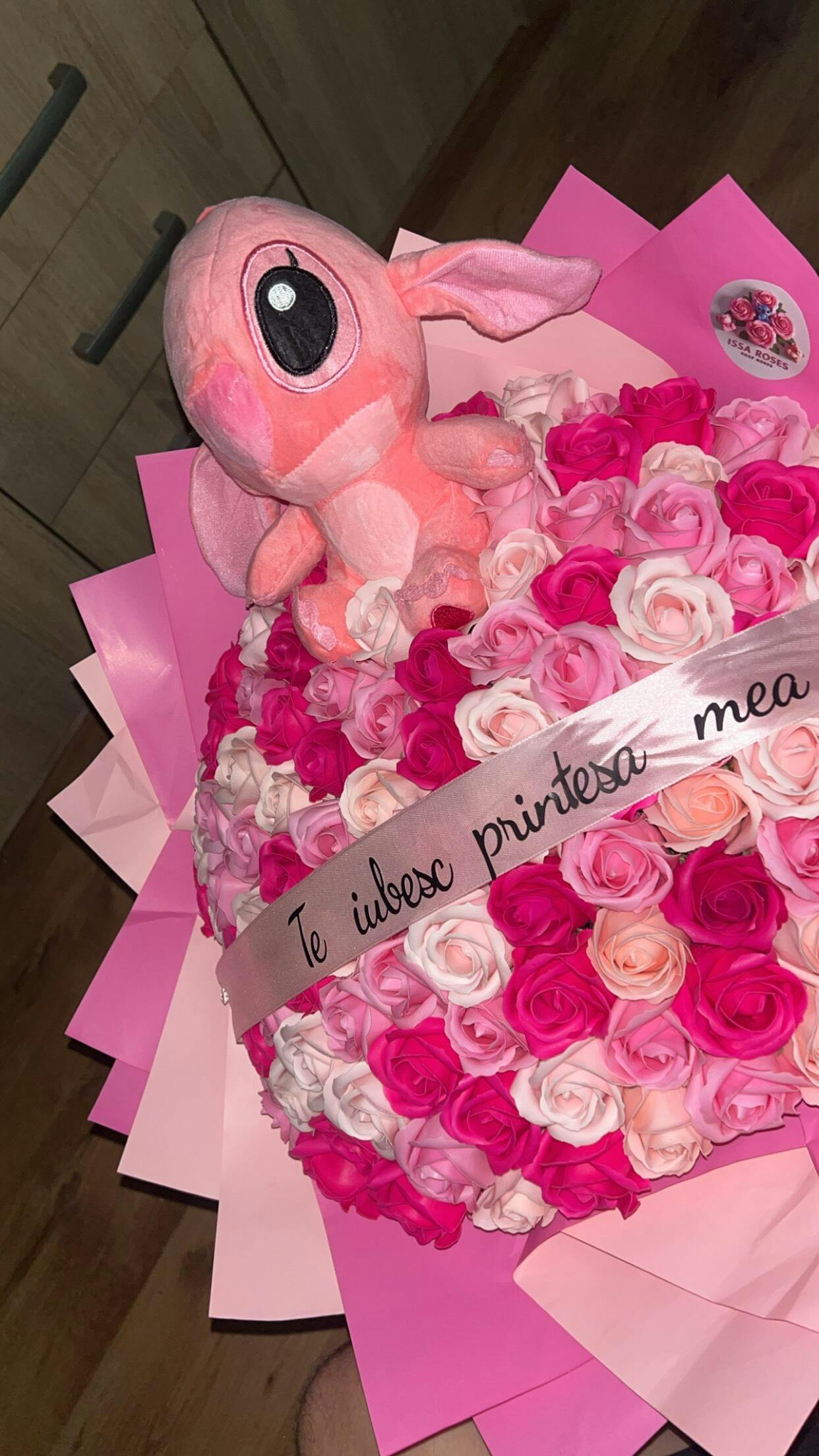 Buchetul contine 101 trandafifi clasici si o Jucarie de plus Stitch Mediu.
