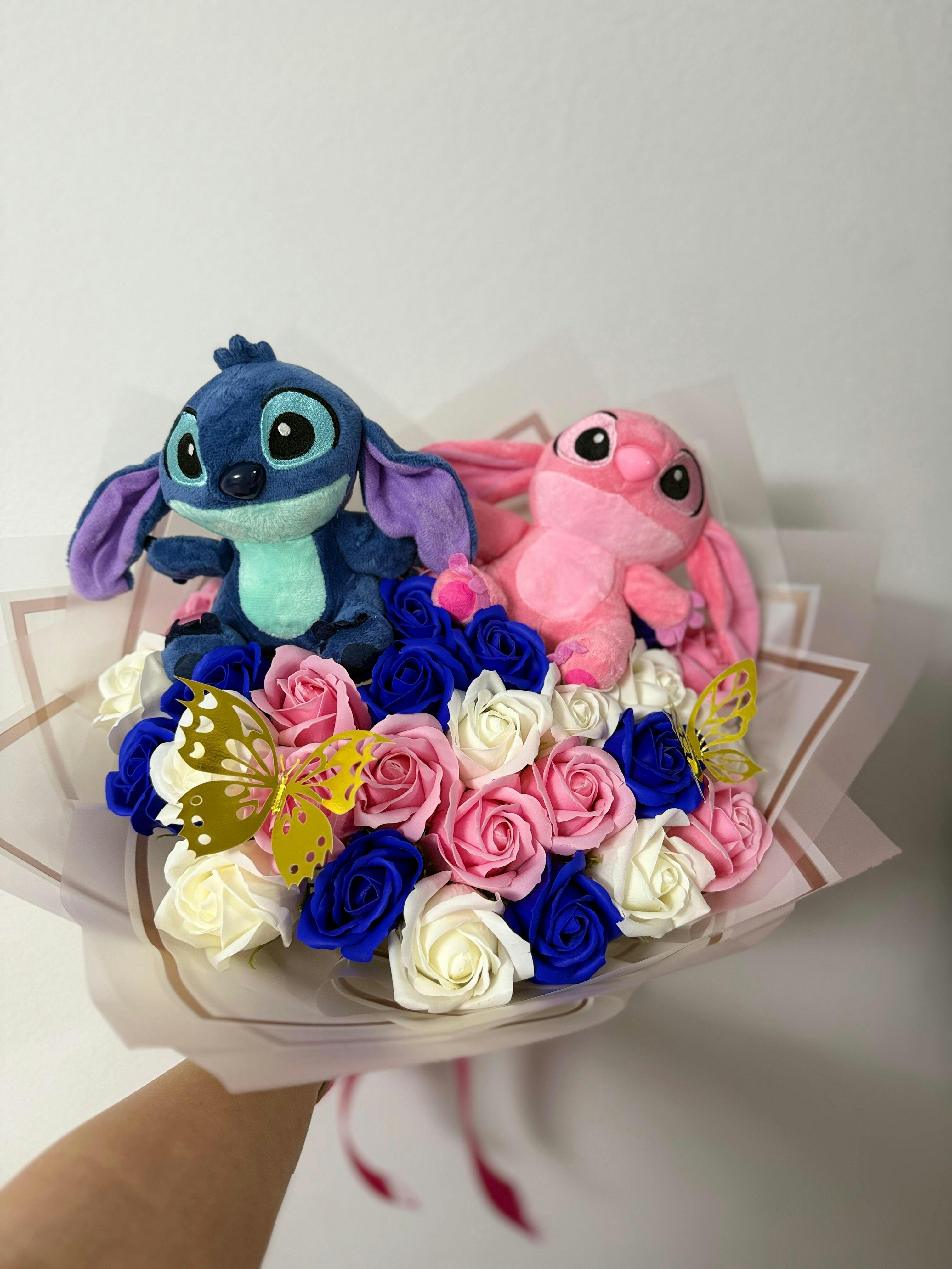 Buchetul contine 31 Trandafiri de sapun + Jucarii Stitch Mic Albastru si Roz