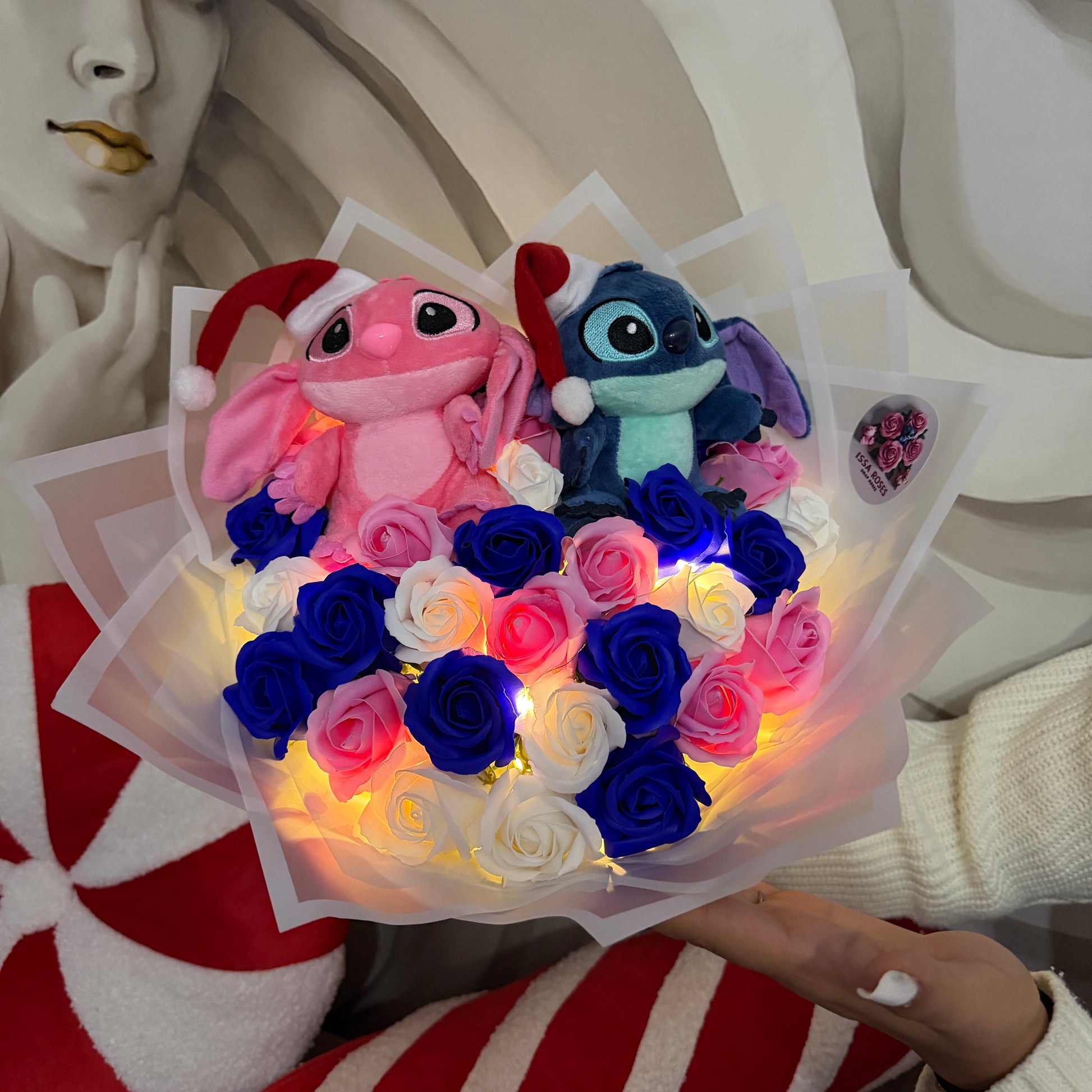 Buchetul contine 31 Trandafiri de sapun + Jucarii Stitch Mic Albastru si Roz + Căciulițe Craciun