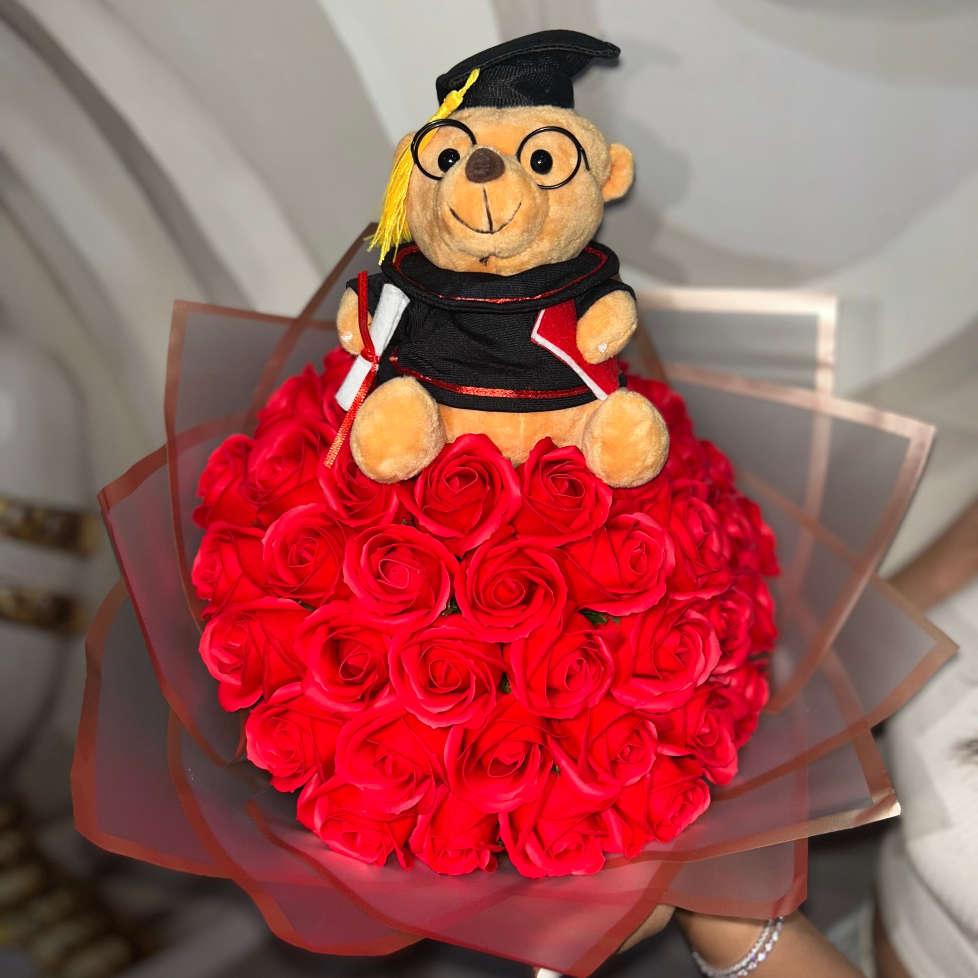 Buchet de trandafiri din săpun cu ursuleț absolvent – Cadoul perfect pentru ziua absolvirii