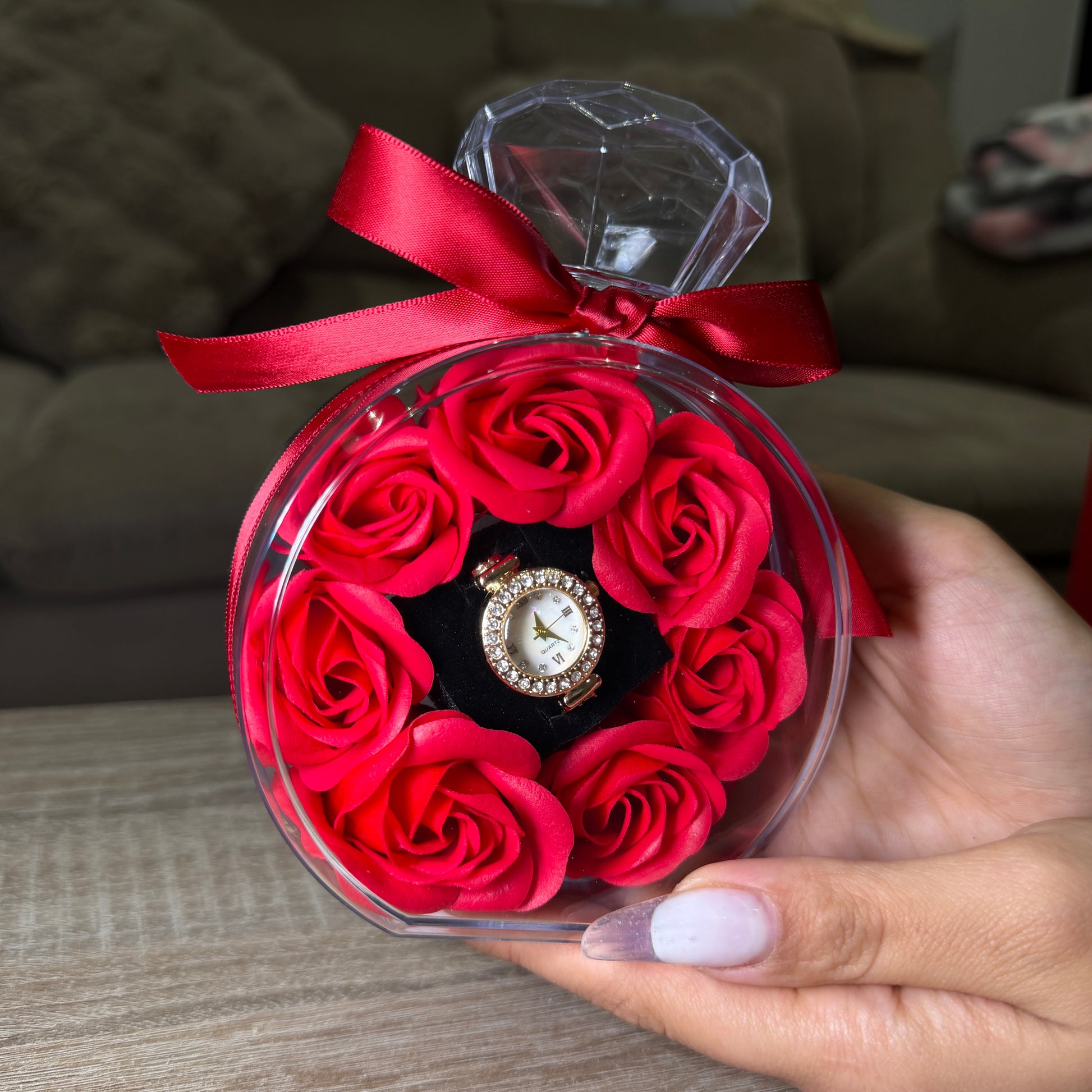 Cutie in forma de diamant, cu trandafiri din sapun. In interior se afla un ceas cadou pentru femei cu aspect quartz elegant. Un cadou romantic si sofisticat, perfect pentru a surprinde si impresiona in momente speciale – Sf Valentin, Dragobete, 8 Martie sau orice surpriza plina de iubire! ❤️