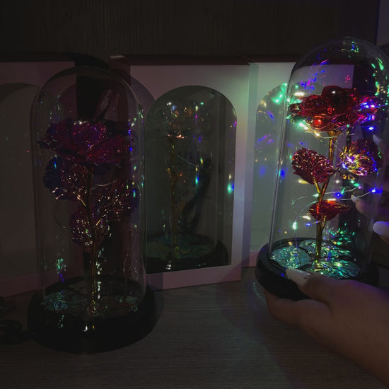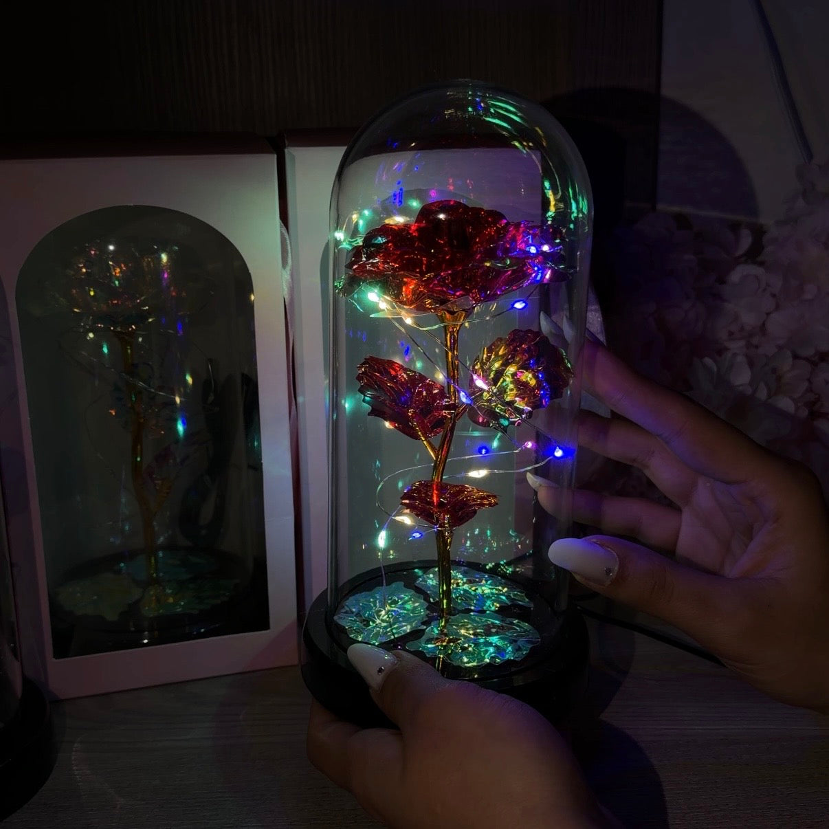 Royal Crystal Rose este un trandafir realizat cu grijă, așezat într-o cupolă transparentă tip cristal și iluminat delicat cu LED-uri calde, pentru un efect magic, desprins parcă din povești.