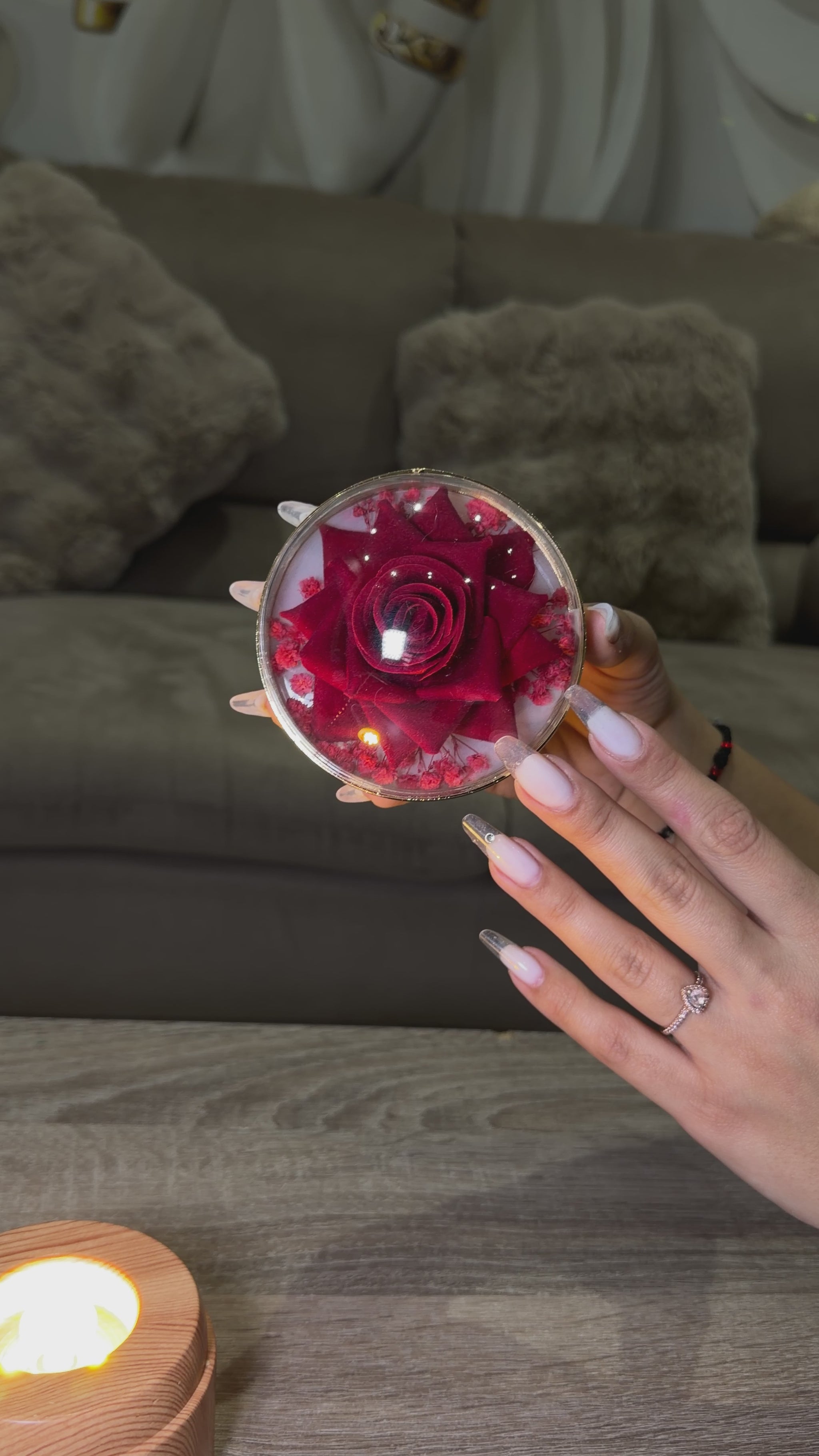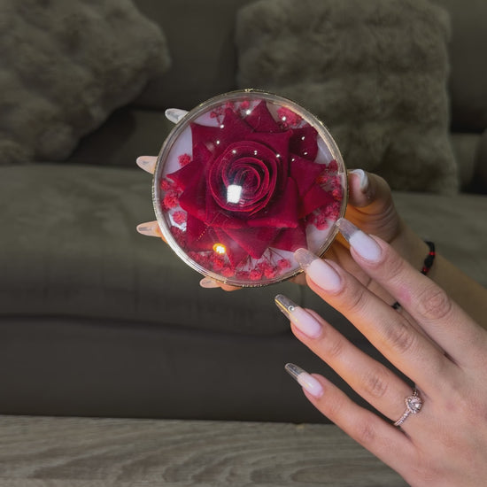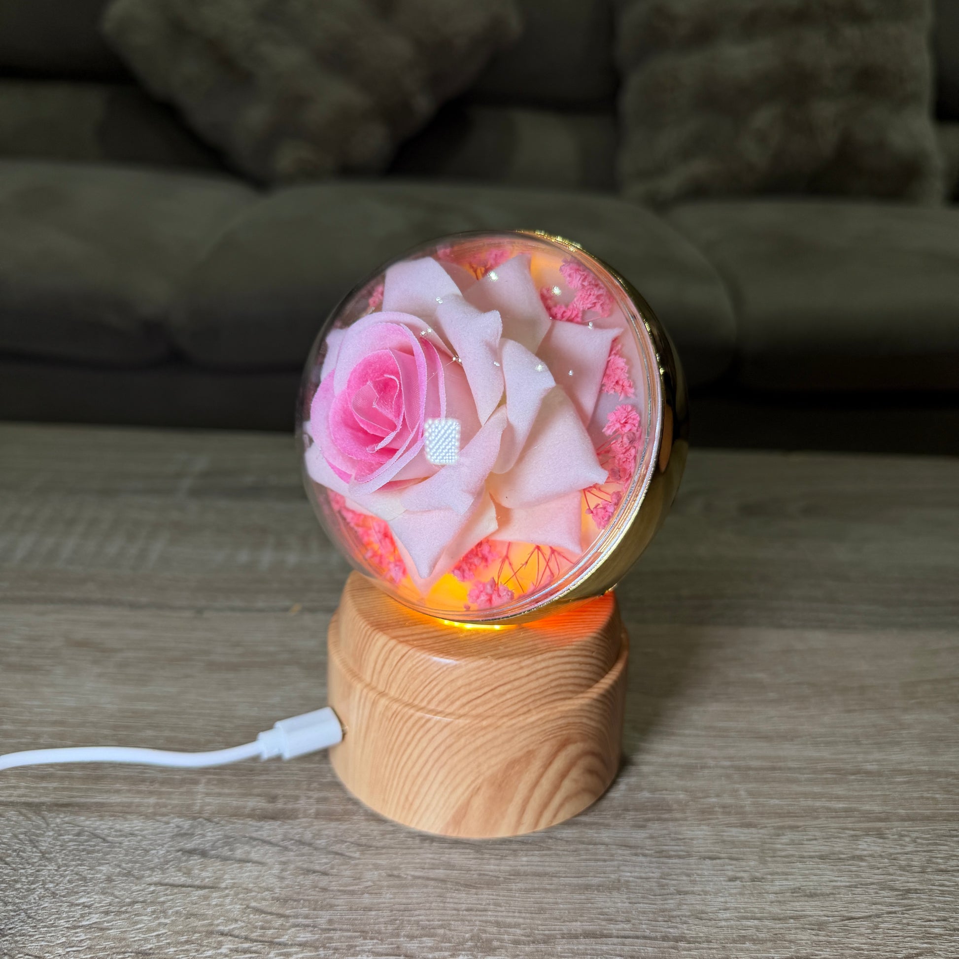 Lampa glob cu 2 trandafiri care lumineaza si se rotesc, alimentata prin cablu USB-C, care este inclus. Cadoul perfect pentru surprize romantice si decor elegant!